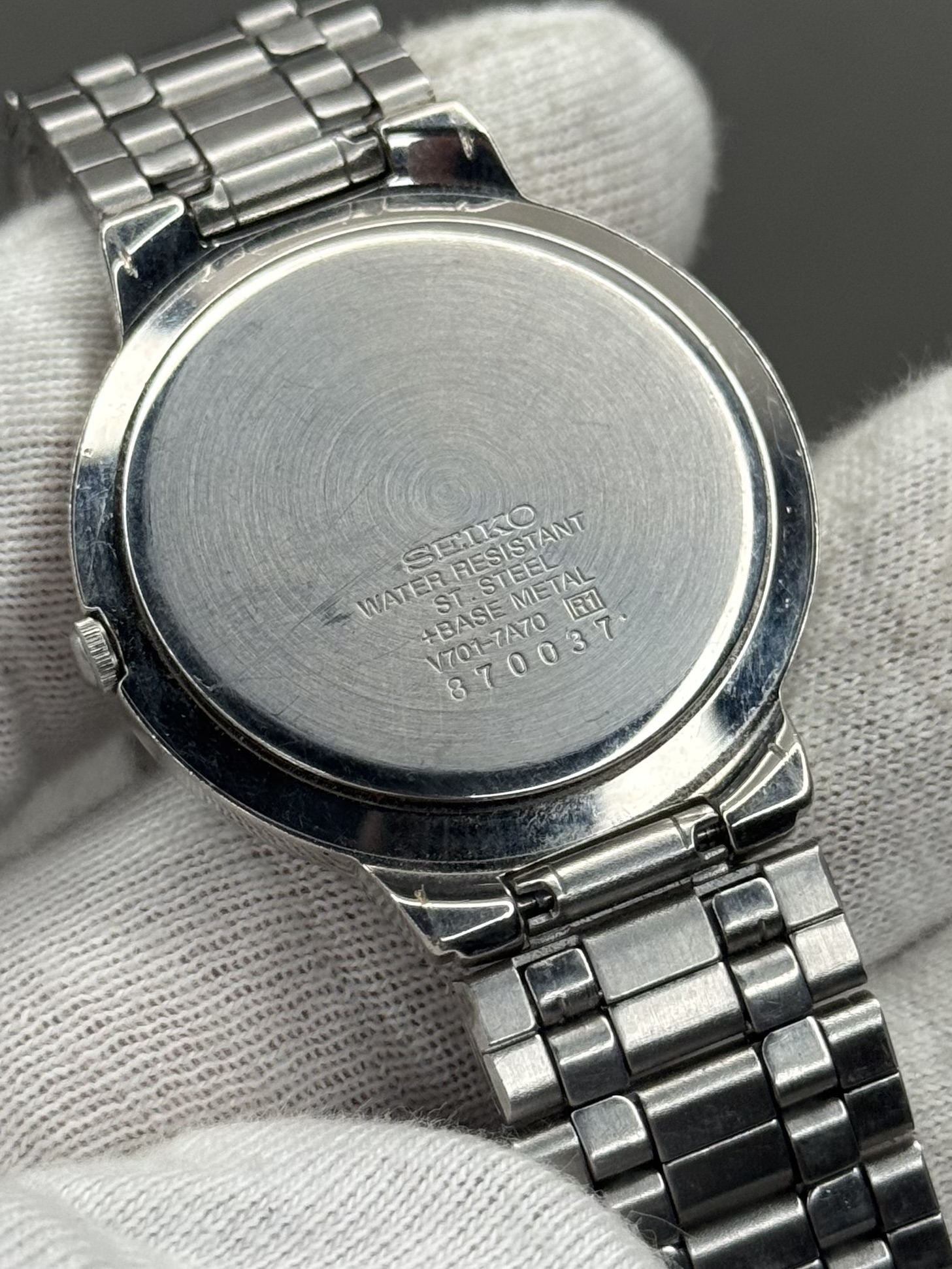 The Seiko Quartz V701-7A70 is a timeless vintage dress watch that reflects Seiko’s dedication to precision and elegant design. With a 34mm stainless steel case, this watch offers a refined and comfortable fit, making it suitable for both daily wear and formal occasions.